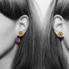 Zrcátkový Perspex na dva způsoby. Vrchní náušnice působí díky gravírování holografickým dojmem. Spodní kolečko je ručně broušené a má perleťové odlesky.