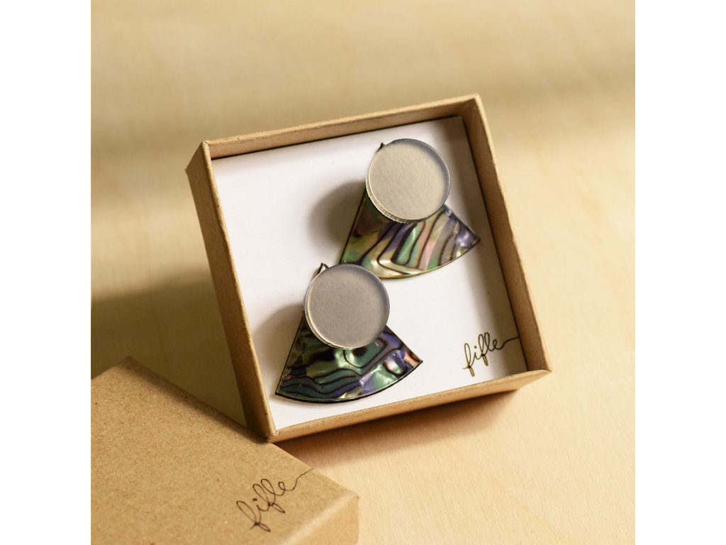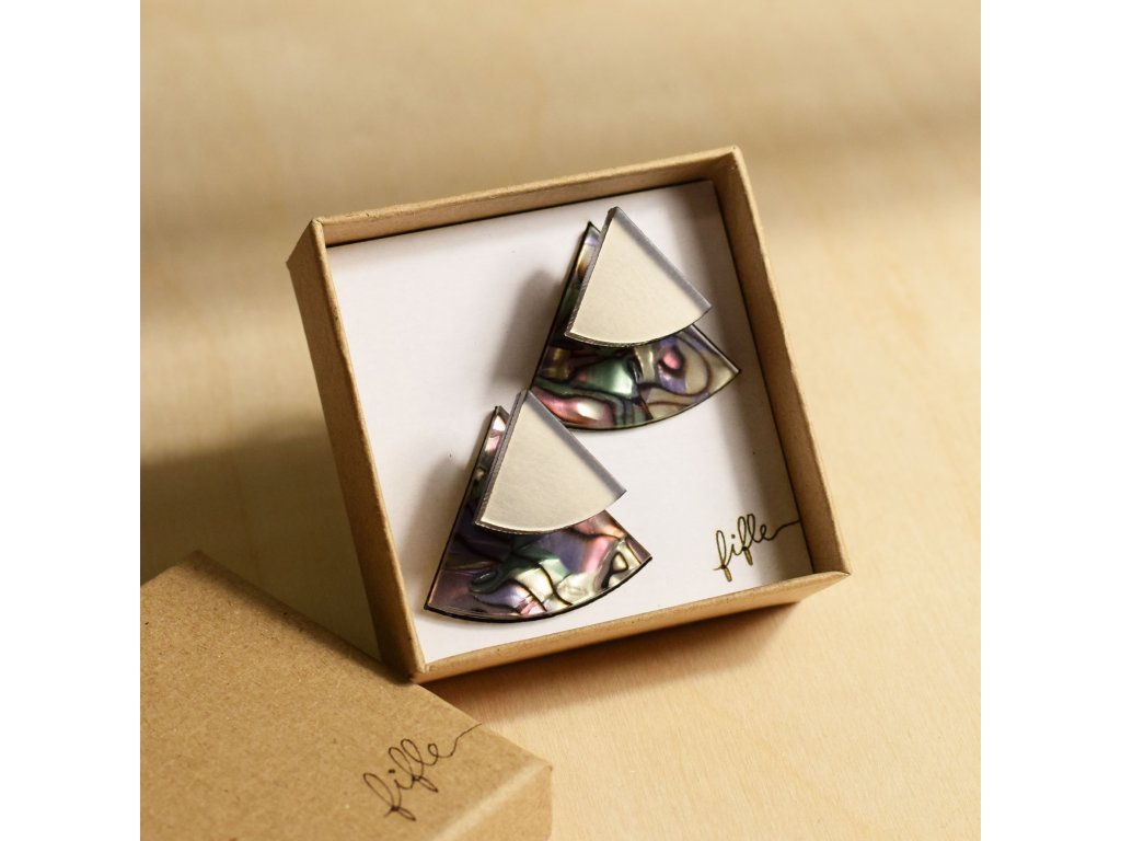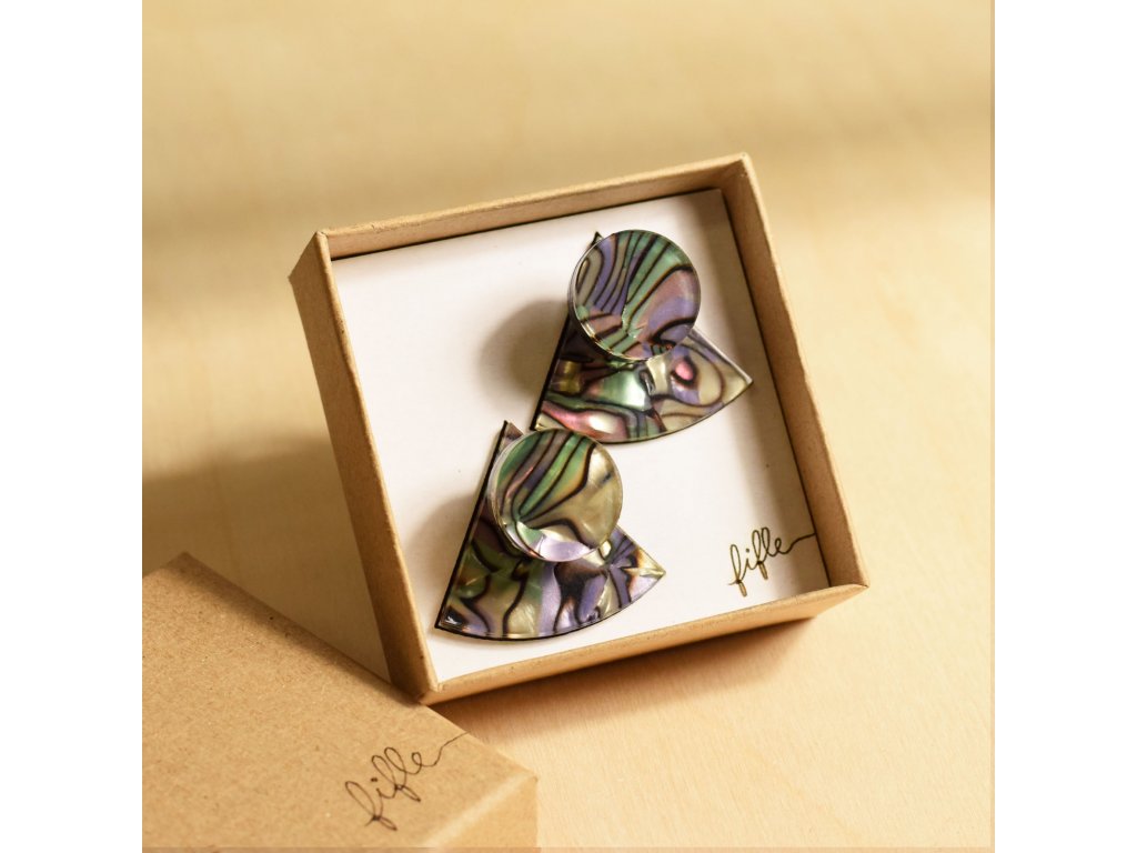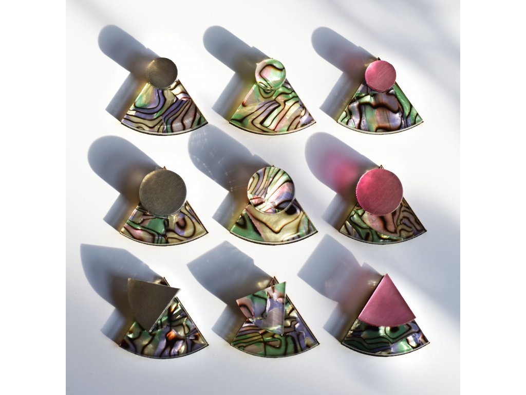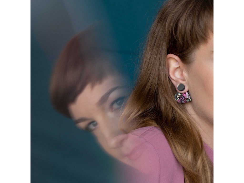 Základní článek těchto záušnic je Perspex s vrstvou měňavého Celuloidu připomínající perleť. Vykukuje zespod ucha a náušnice se s ním zapíná. Se kterým dílem ho zkombinuješ, záleží jen na tobě. Nezapomeň, že vrchní díl lze nosit i samostatně.