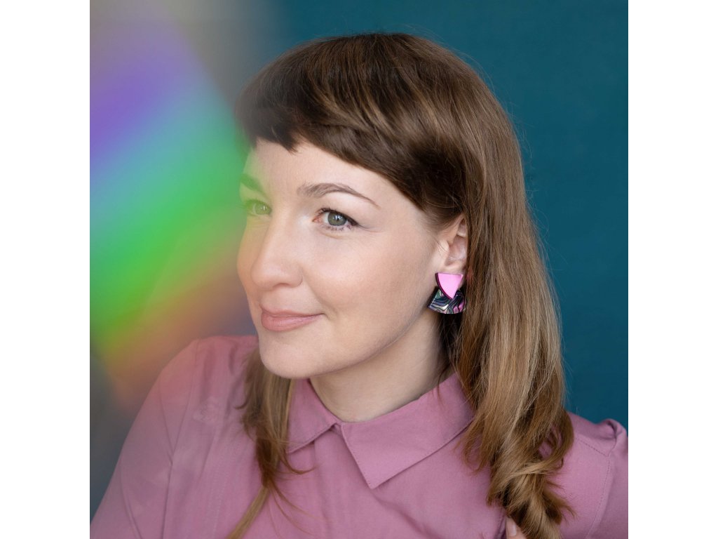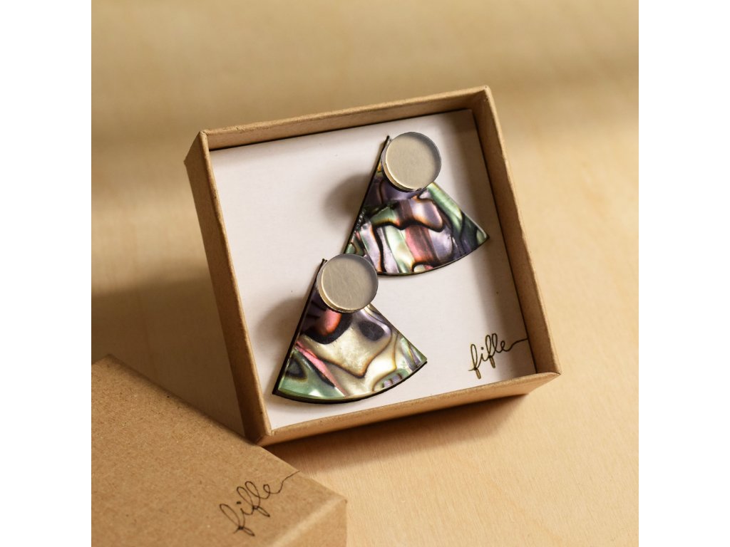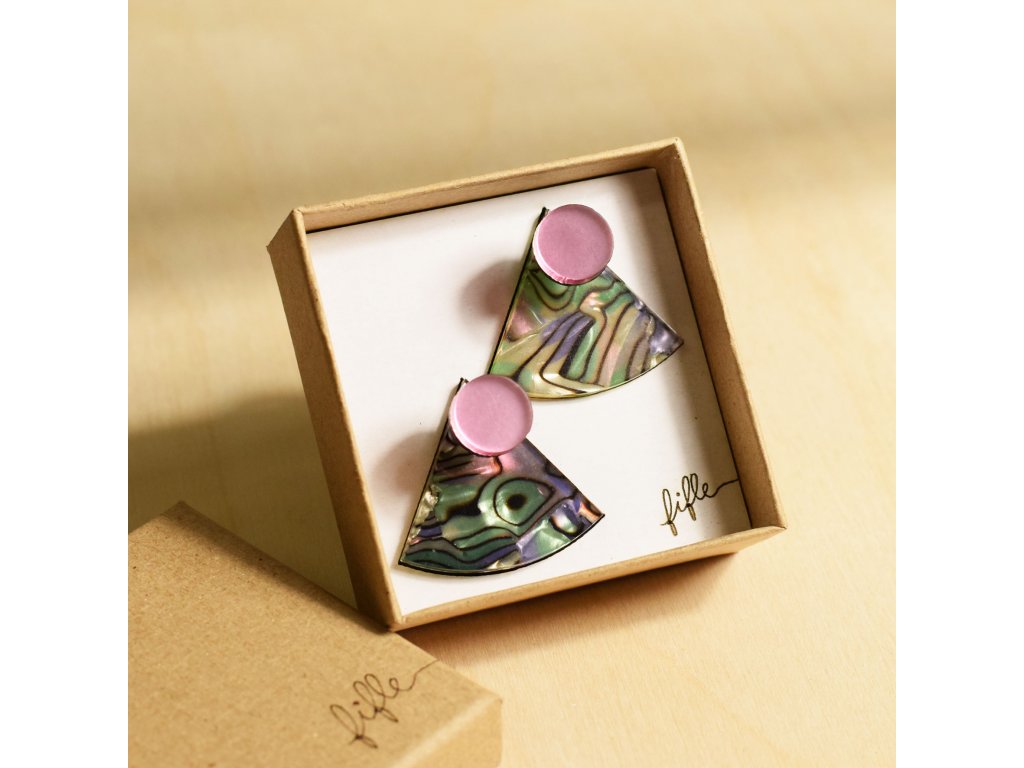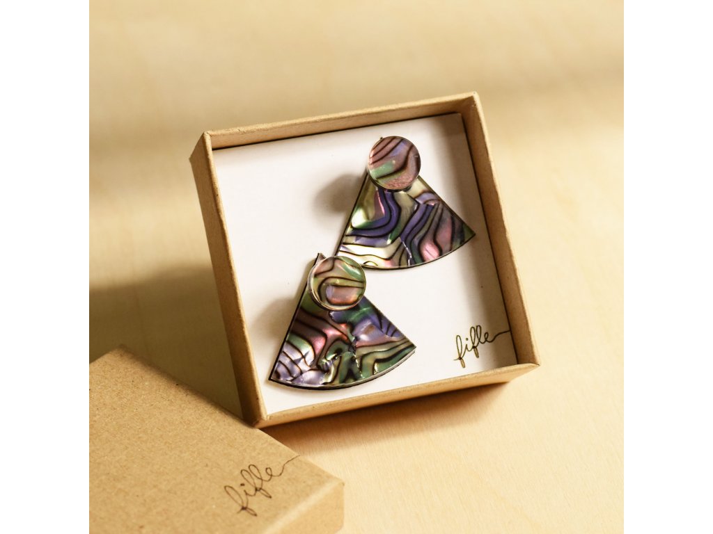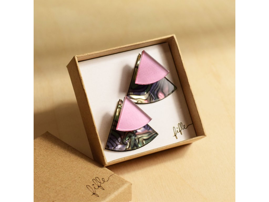 Základní článek těchto záušnic je Perspex s vrstvou měňavého Celuloidu připomínající perleť. Vykukuje zespod ucha a náušnice se s ním zapíná. Se kterým dílem ho zkombinuješ, záleží jen na tobě. Nezapomeň, že vrchní díl lze nosit i samostatně.