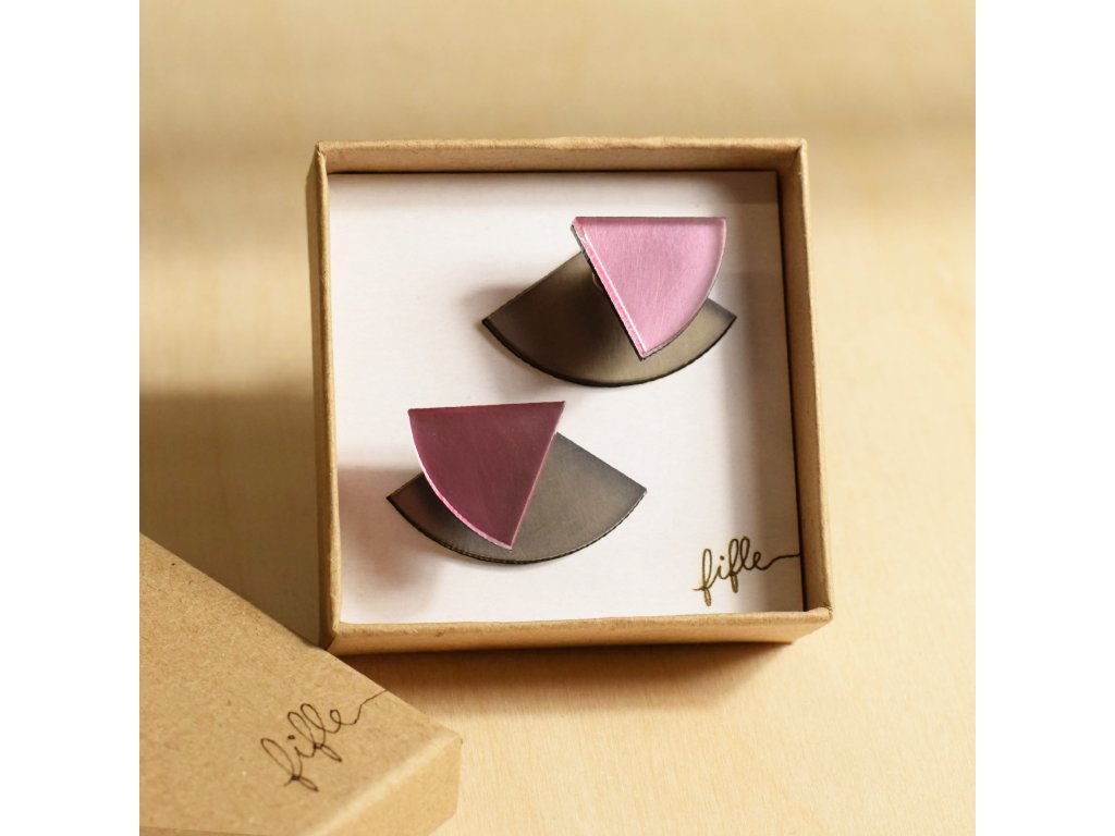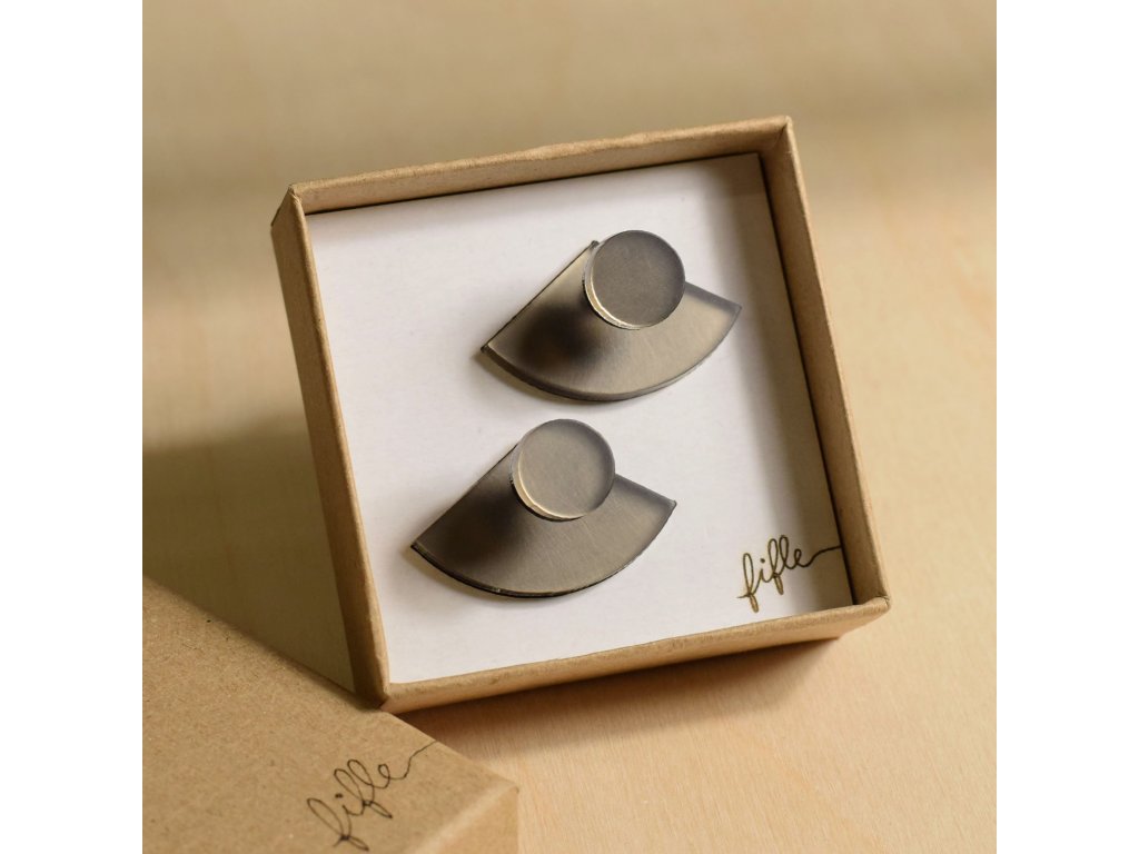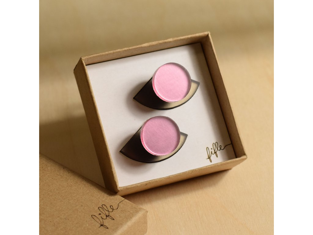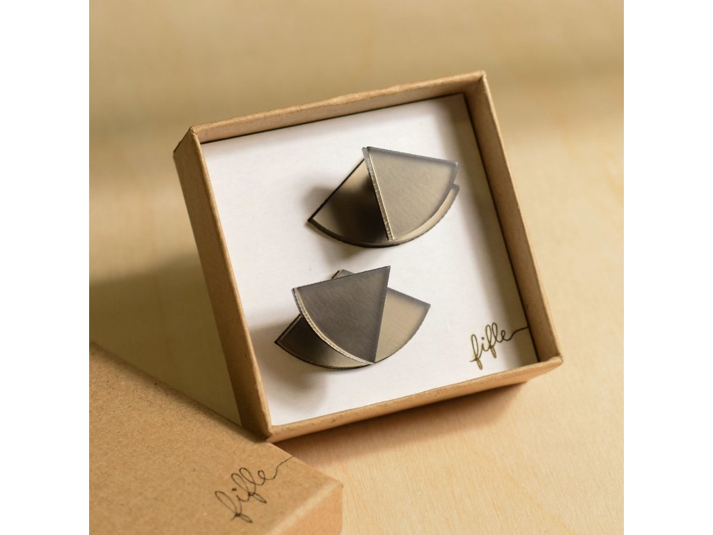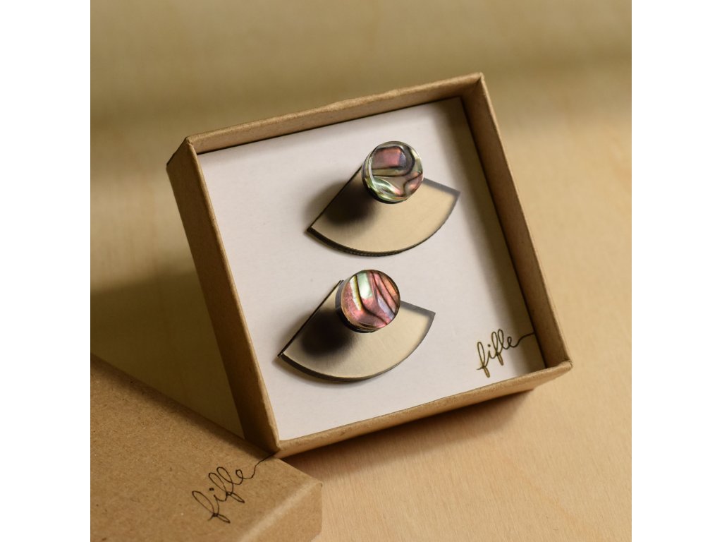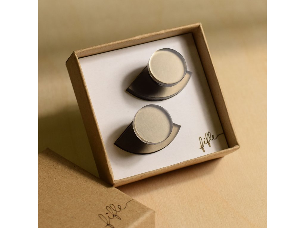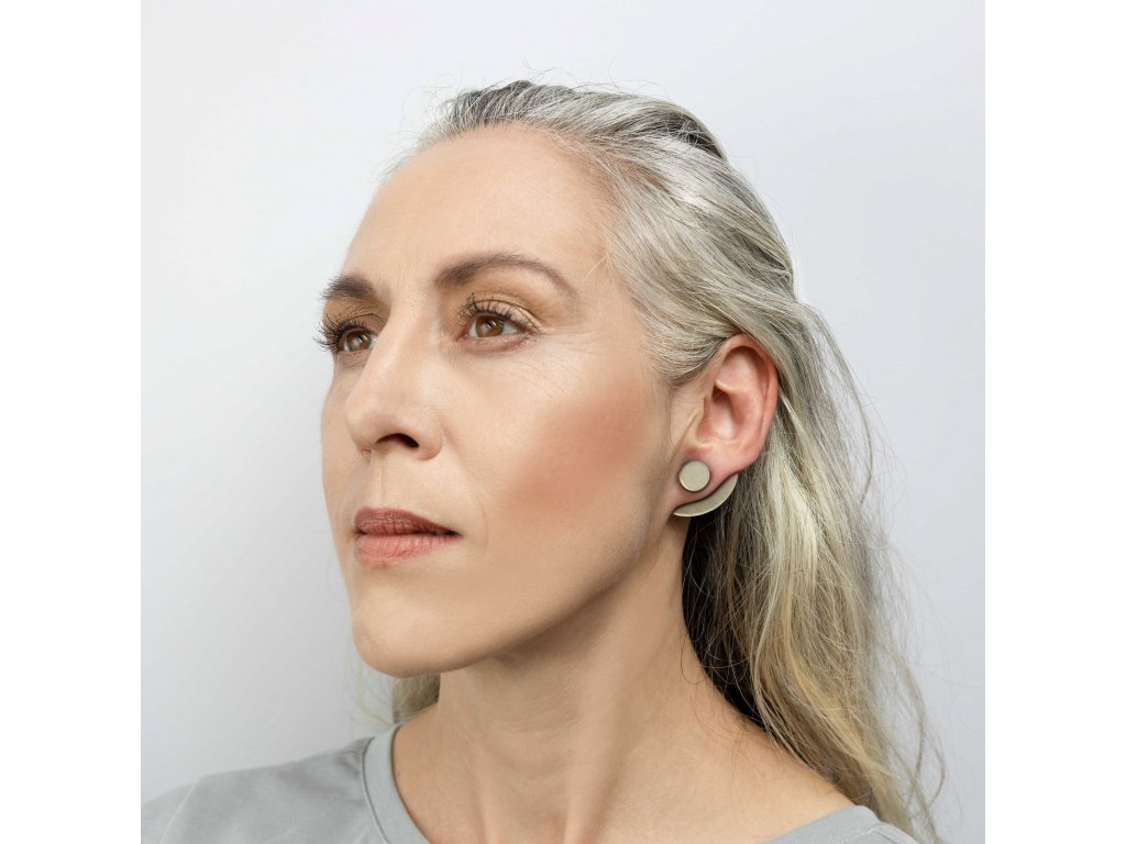 Základní článek těchto záušnic je měděný zrcátkový Perspex, který vykukuje zespod ucha a náušnice se jím zapíná. Je ručně broušený a tak má metalické odlesky. Se kterým dílem ho zkombinuješ, záleží jen na tobě. Nezapomeň, že vrchní díl lze nosit i samostatně.