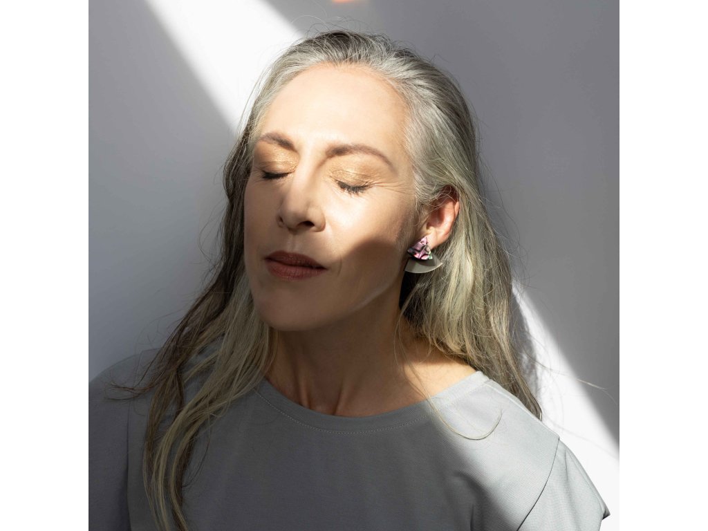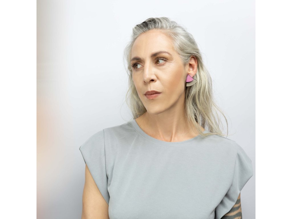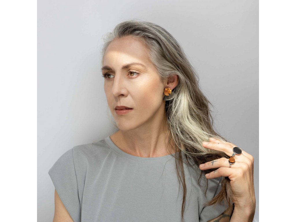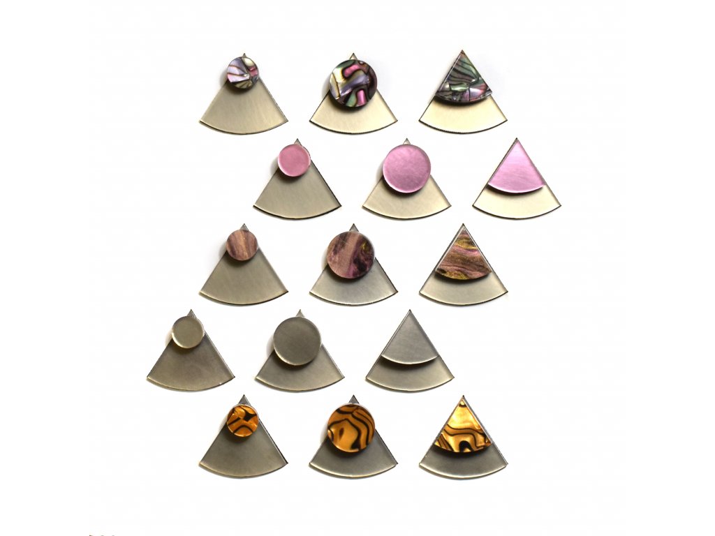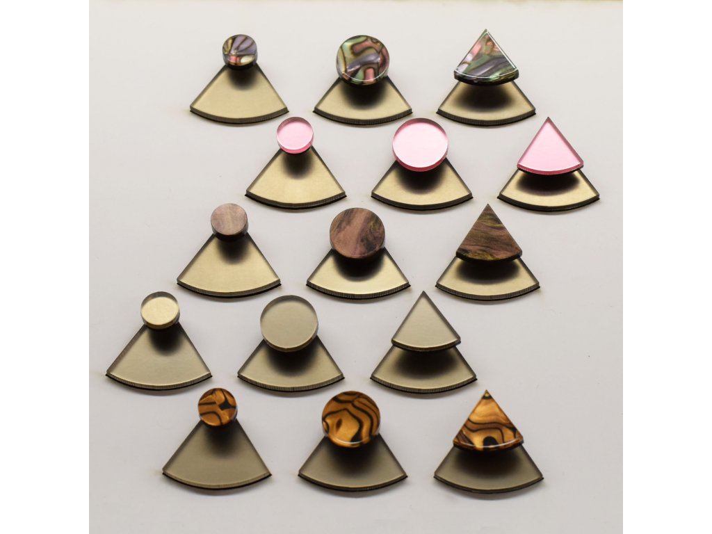 Základní článek těchto záušnic je měděný zrcátkový Perspex, který vykukuje zespod ucha a náušnice se jím zapíná. Je ručně broušený a tak má metalické odlesky. Se kterým dílem ho zkombinuješ, záleží jen na tobě. Nezapomeň, že vrchní díl lze nosit i samostatně.