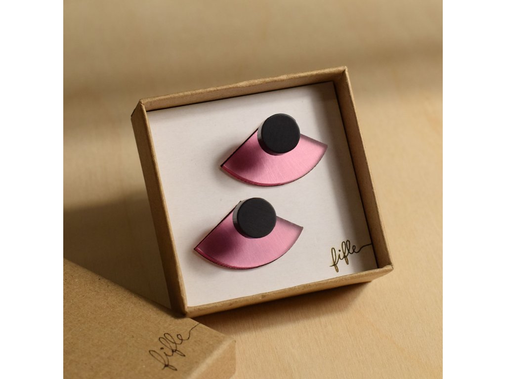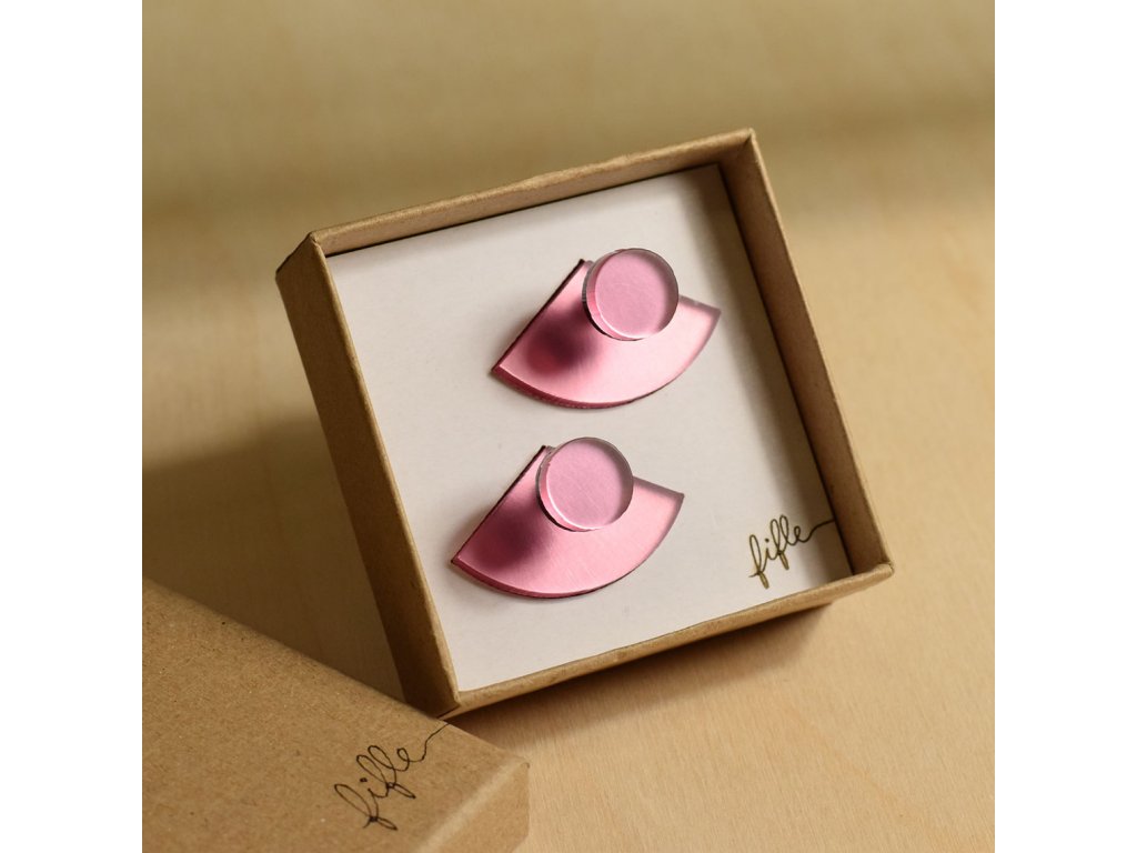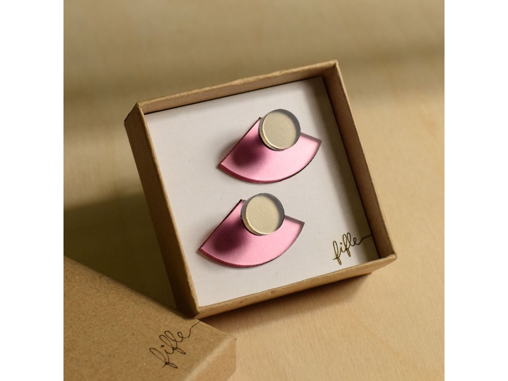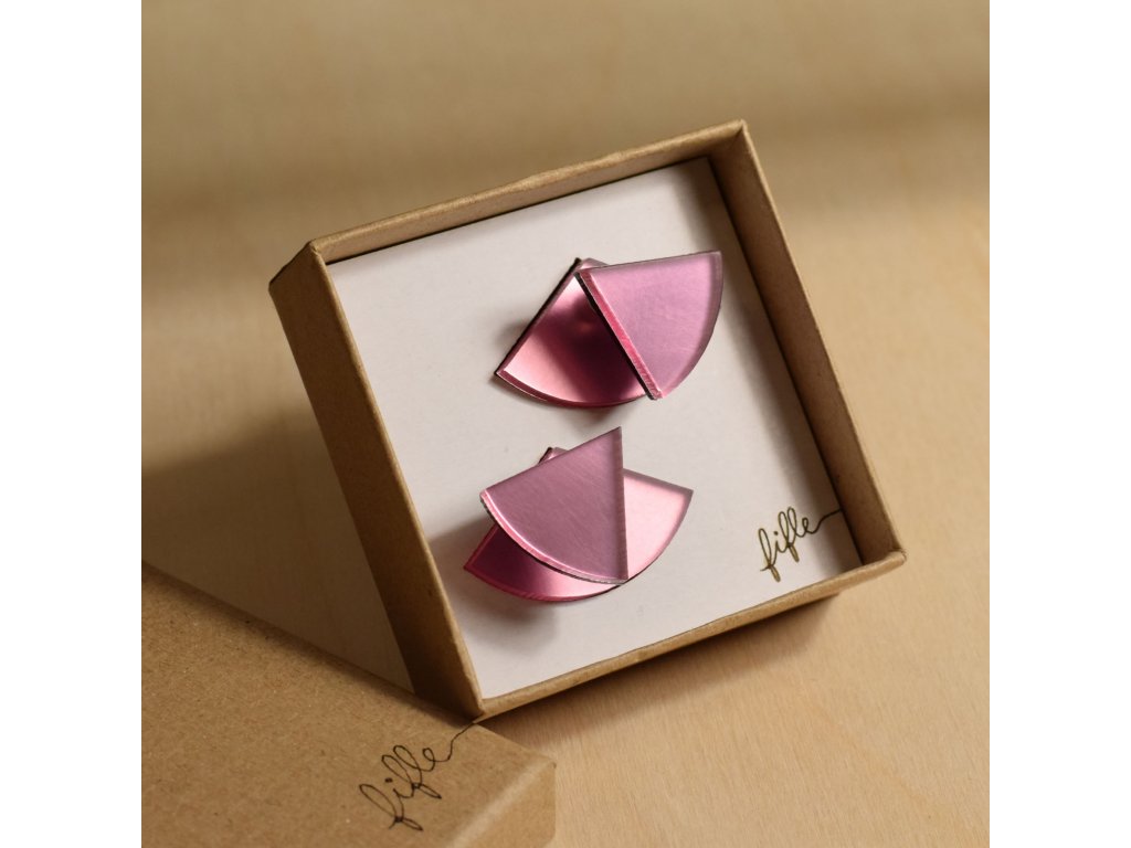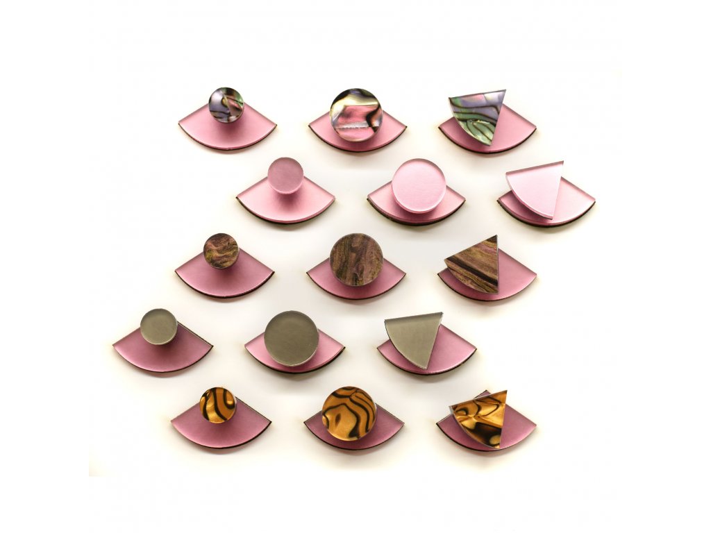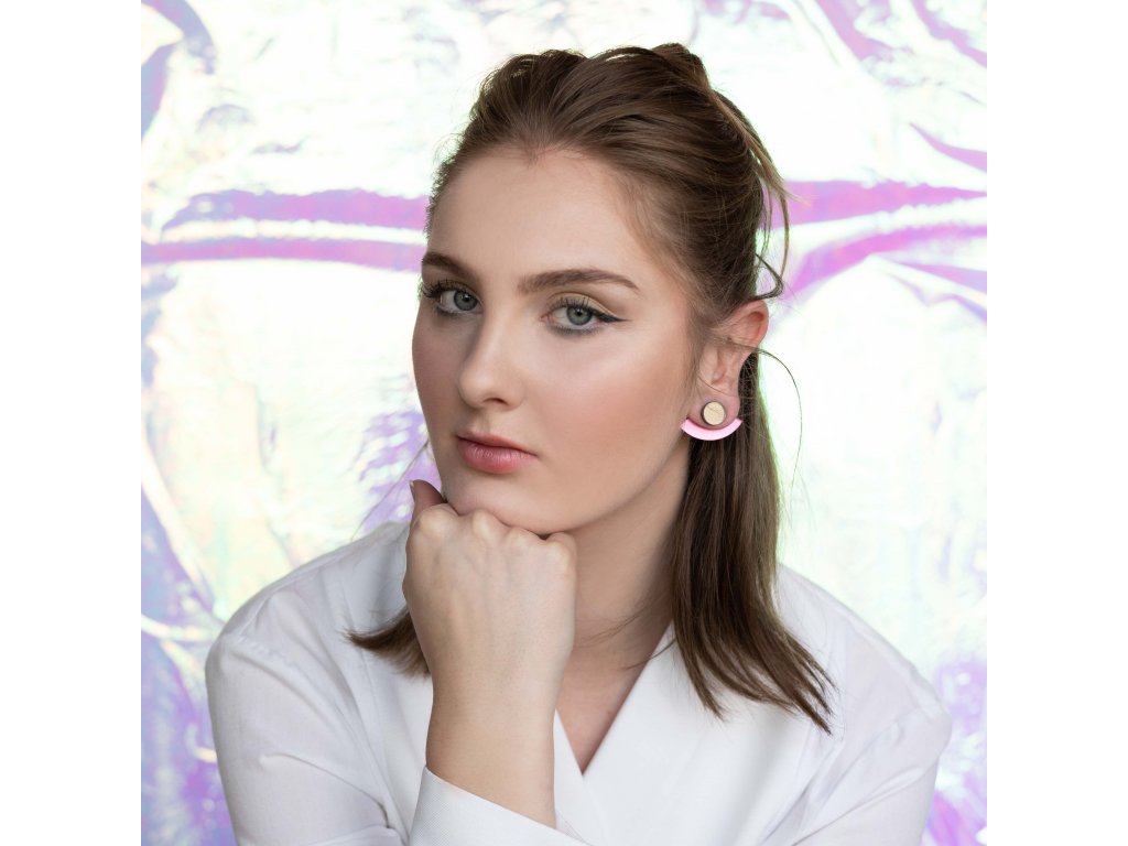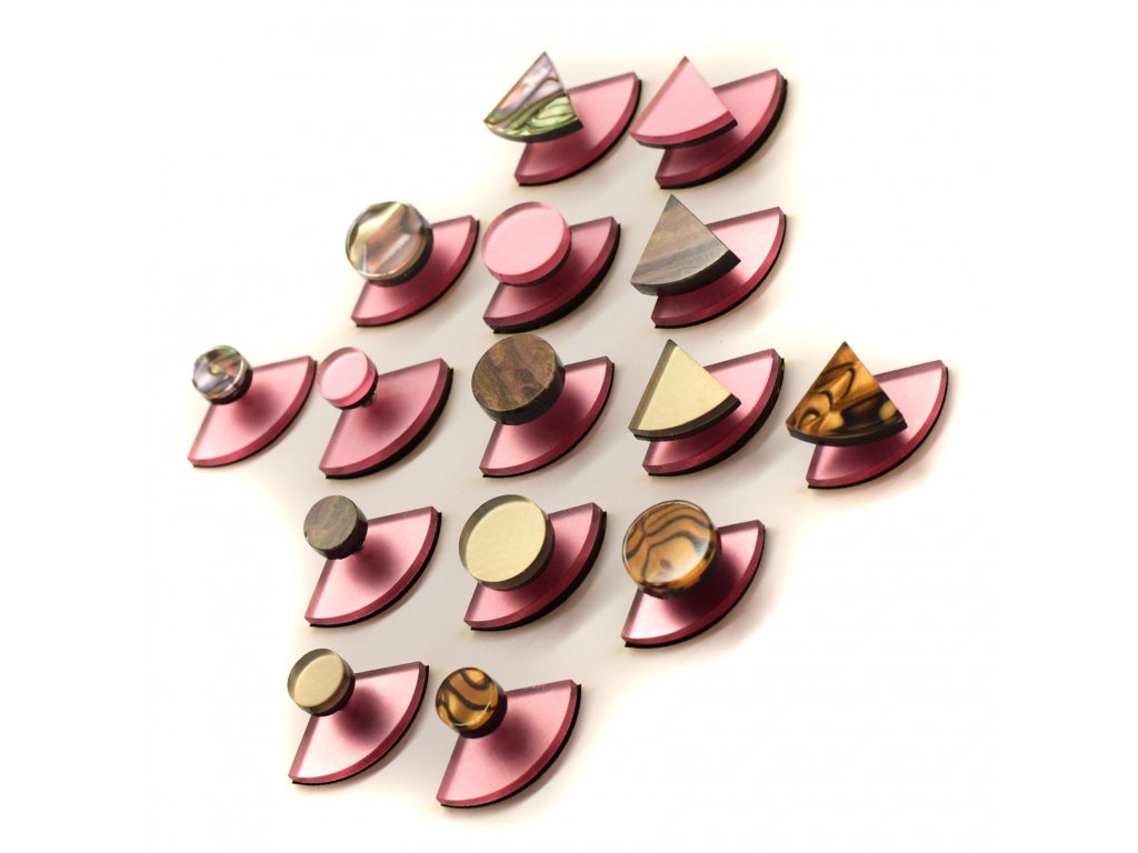 Základní článek těchto záušnic je růžový zrcátkový Perspex, který vykukuje zespod ucha a náušnice se jím zapíná. Je ručně broušený a tak má metalické odlesky. Se kterým dílem ho zkombinuješ, záleží jen na tobě. Nezapomeň, že vrchní díl lze nosit i samostatně.