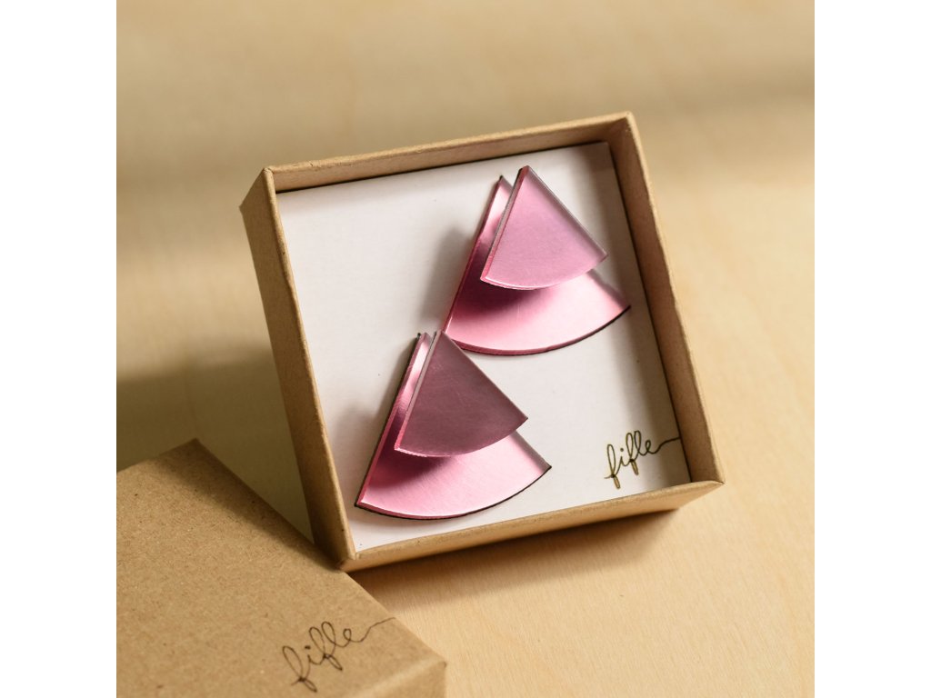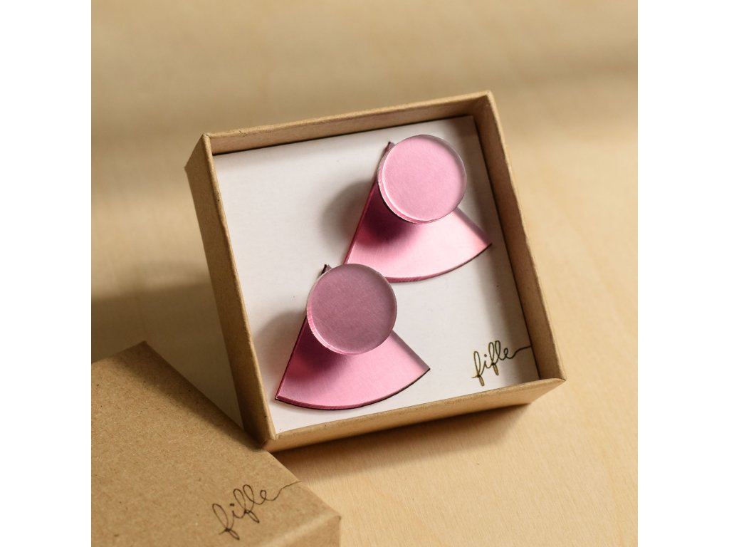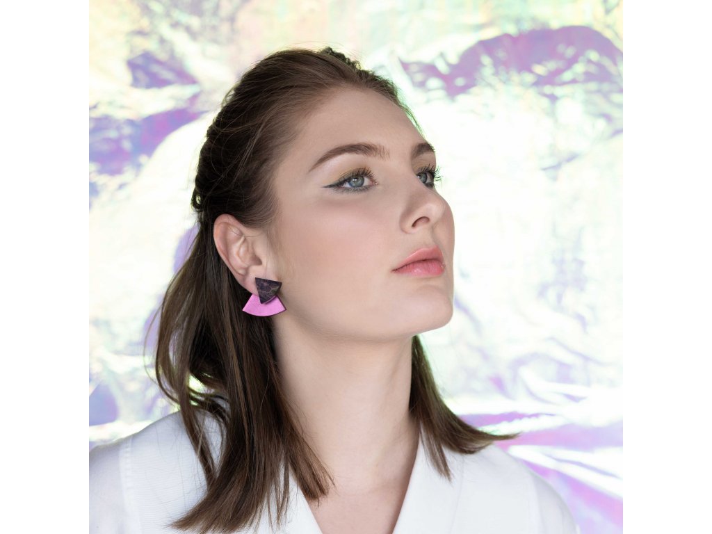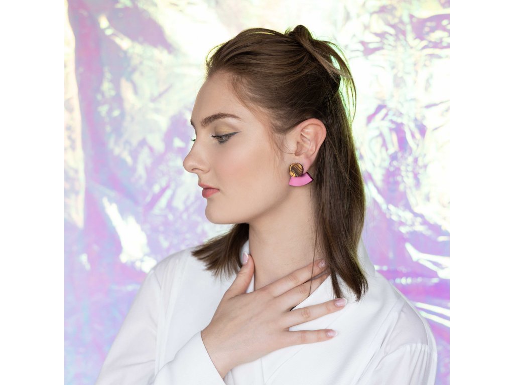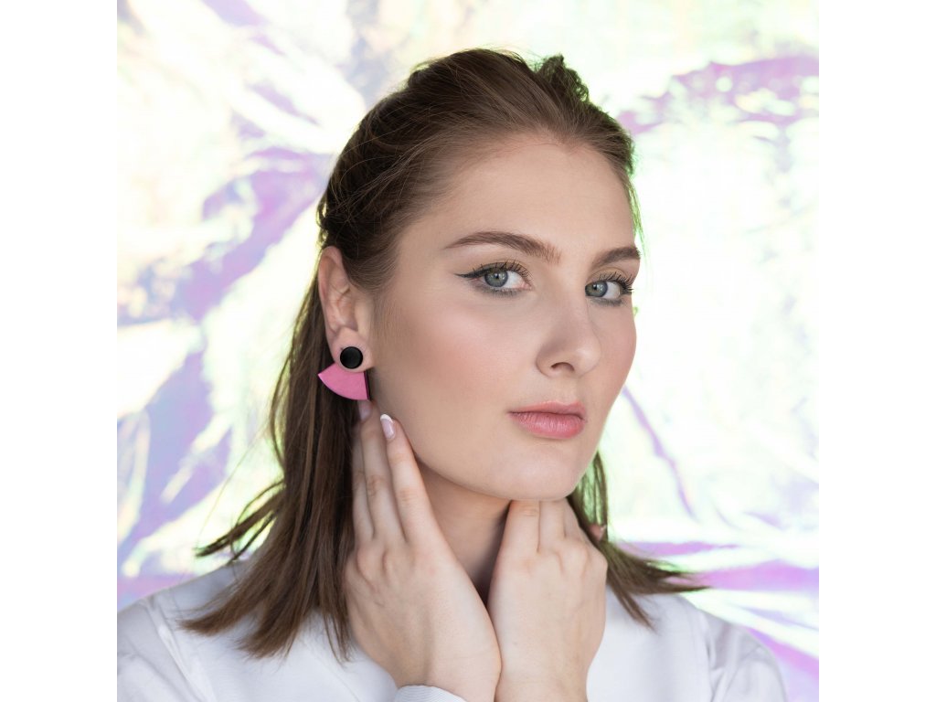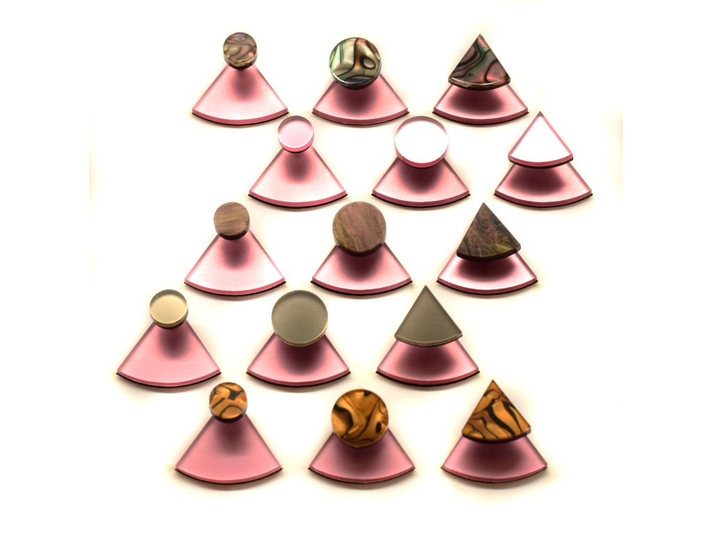 Základní článek těchto náušnic je růžový zrcátkový Perspex, který vykukuje zespod ucha a náušnice se jím zapíná. Je ručně broušený a tak má metalické odlesky. Se kterým dílem ho zkombinuješ, záleží jen na tobě. Nezapomeň, že vrchní díl lze nosit i samostatně.