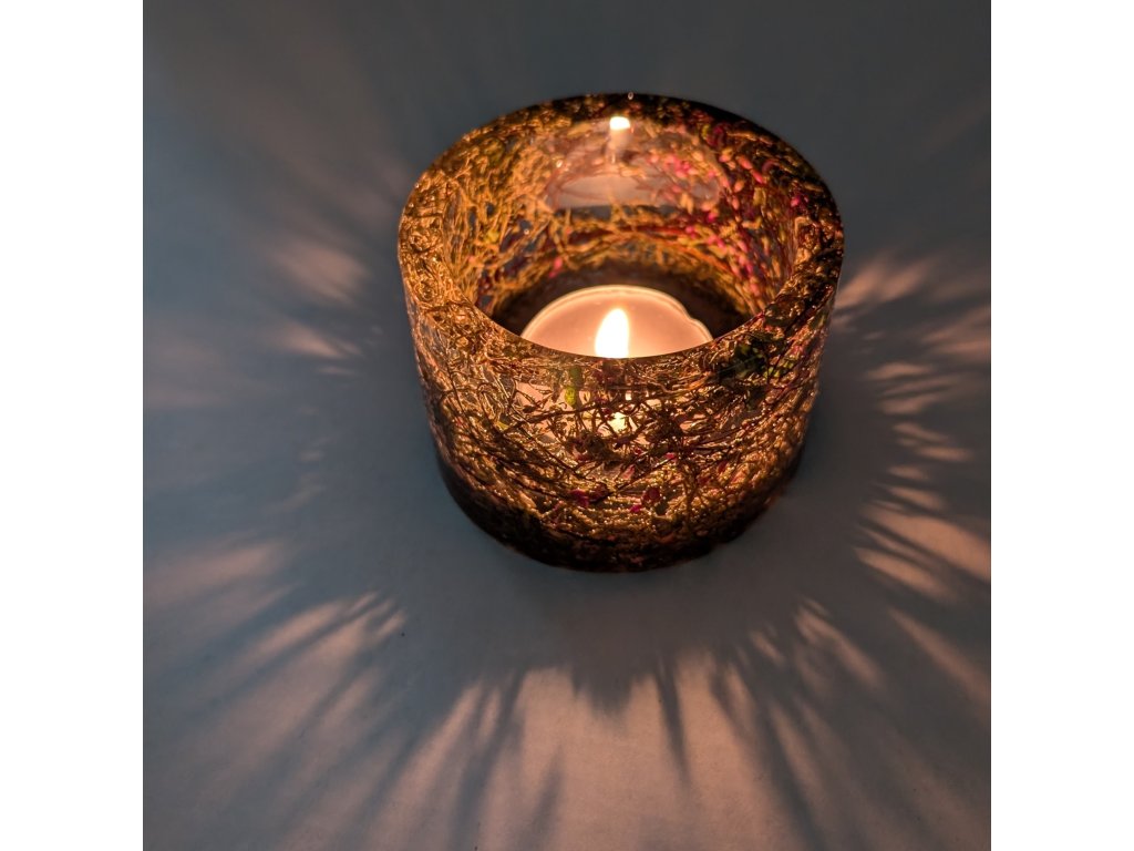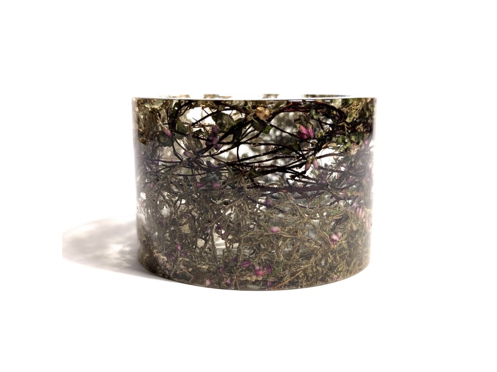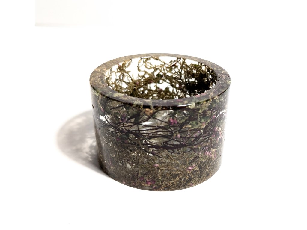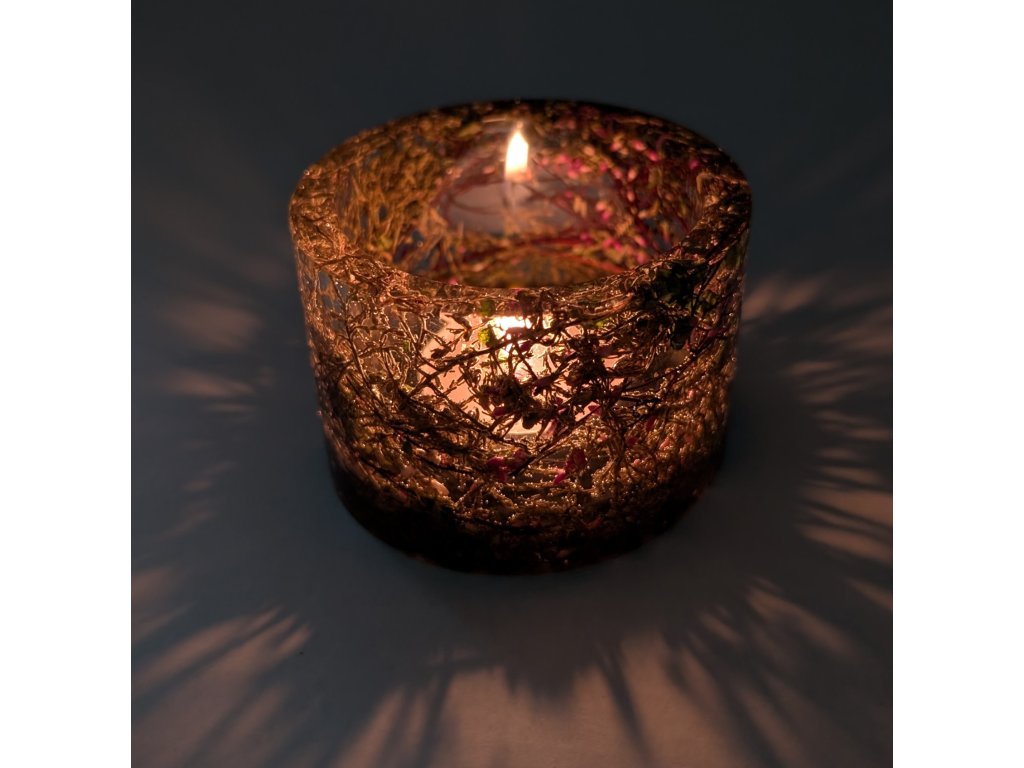 Každý svícen je jedinečný originál. Tento je vyrobený z vřesu a pryskyřice.